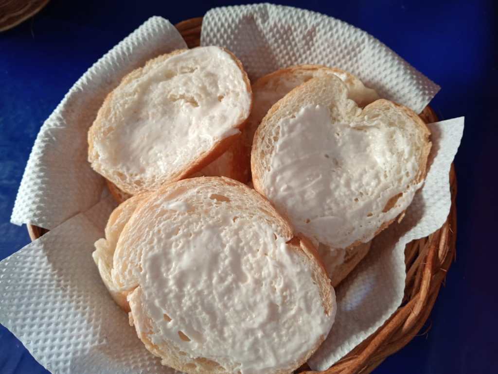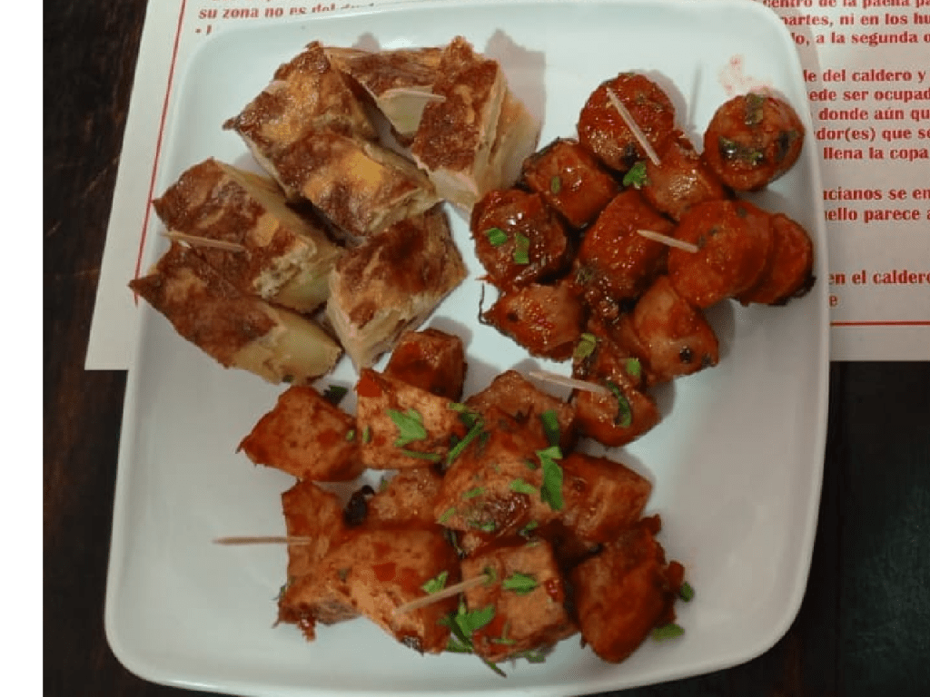 Tortilla española, papas bravas, chorizo picantico y pan con alioli.
